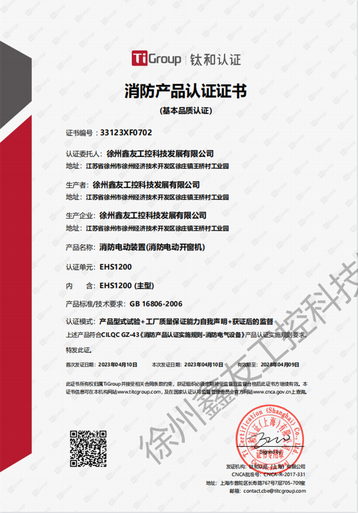 徐州鑫友工控科技發(fā)展有限公司成立于2008年,占地31600平方米,全資子公司:江蘇良紫工程科技有限公司,旗下 有“鑫友”及“MASTER.W主人窗控”兩個(gè)品牌系列,公司全面貫徹執(zhí)行IS09001:2015質(zhì)量管理體系標(biāo)準(zhǔn),產(chǎn)品順利通過(guò)歐盟CE認(rèn)證和中國(guó)***消防電子產(chǎn)品認(rèn)證,通過(guò)可燃性粉塵環(huán)境下、爆炸性環(huán)境下防爆合格產(chǎn)品檢驗(yàn)。排煙天窗整窗通過(guò)***消防產(chǎn)品質(zhì)量監(jiān)督檢驗(yàn)中心檢測(cè)。先后獲得多項(xiàng)******及榮譽(yù)證書(shū)。集研發(fā)、加工、生產(chǎn)、制造、銷(xiāo)售、安裝及售后于一體,是一家高起點(diǎn)、研發(fā)能力強(qiáng)的專業(yè)智能化***技術(shù)企業(yè)。